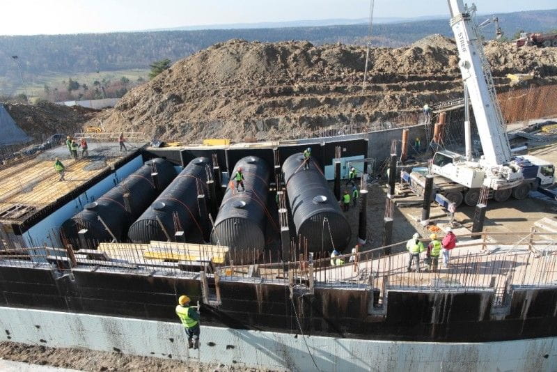 In all 5 Weho tanks were delivered by Uponor Infra to the East European Congress and Sports Centre Arłamów including 4 expansion tanks for drinking water of total capacity 300 m3 and 1 fire sprinkler water tank of 75 m3 capacity, all ring stiffness SN6. The tanks were delivered to installation site in October 2011 by five trucks with pilots and installed within several hours. Installation work began at 7 a.m and by 1 p.m the tanks were lowered onto gravel bedding directly above strip footings. Soon after the Uponor Infra service team welded inspection chimneys onto the tanks. After installation work was completed the space between the tanks was backfilled with aggregate and compressed to make way for the construction of the ceiling, which shall bear ventilation rooms and an indoor swimming pool. The installation went smoothly. In fact, the investor was surprised at the speed of the work.