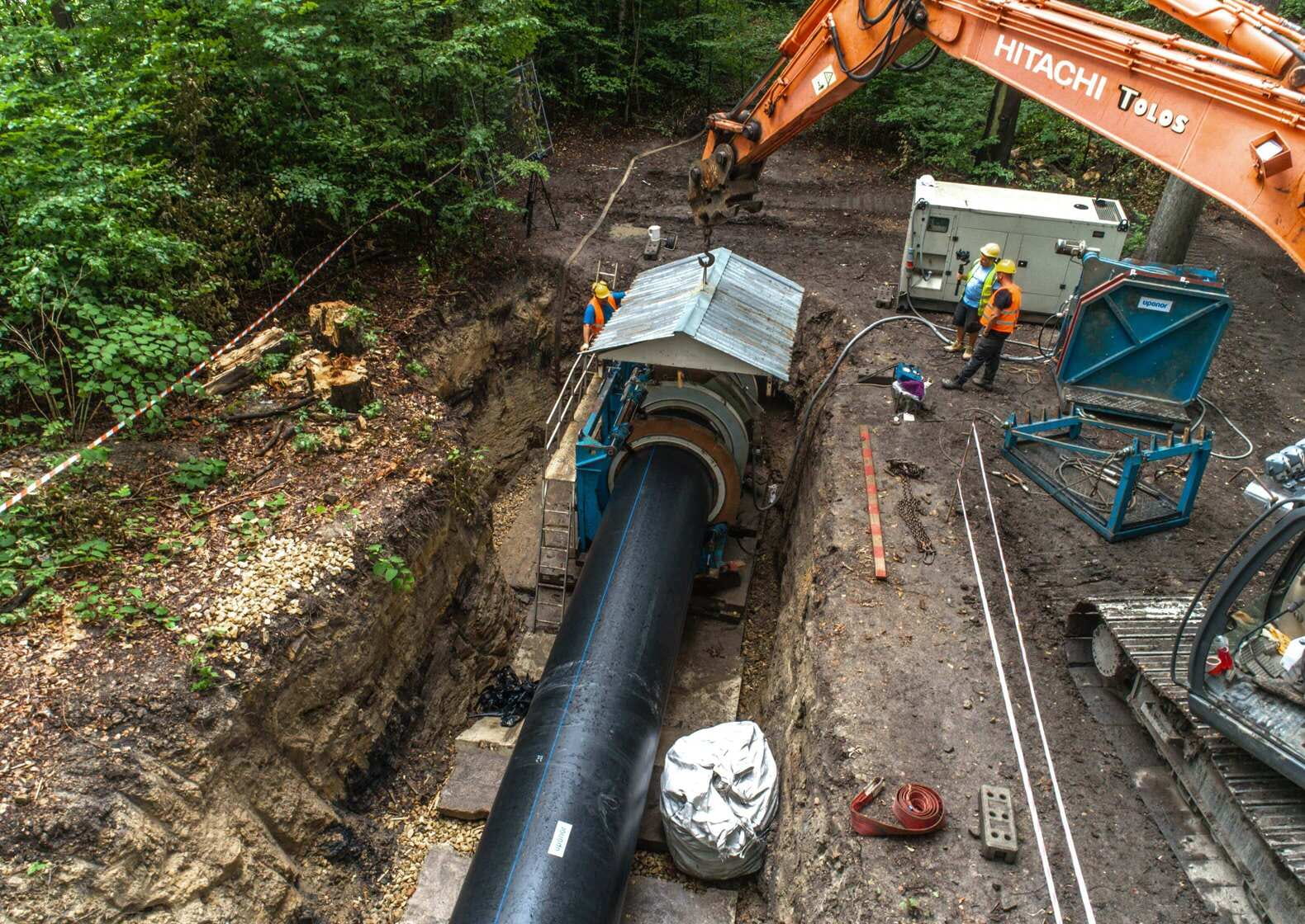 This task consisted in installing new pipe elements with diameters of 1,400 and 1,300 mm in an old steel pipeline with a diameter of 1,600 mm. On the one hand, because of the complexity of the terrain, and on the other hand – because of the speed of work, it was decided to use pressure pipes made of PE-HD polyethylene, manufactured by Uponor Infra sp. z o.o. 719 m of WehoPipe PE100 DN1400 x 53.5 PN6.3 SDR26 pipes, and 1,172 m of WehoPipe PE100 DN1300 x 77 PN10 SDR17 pipes were also used. Pipes were joined using butt welding, which guarantees one hundred percent tightness and uniform strength of the structure along its entire length. Such a solution made it possible to pull in such long sections of the pipeline and also to meet the requirements related to the execution of projects in the area of mining damage.