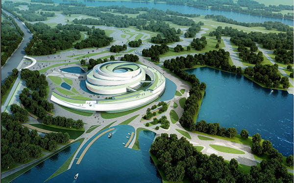 北京园博会主展馆占地3.2公顷,建筑面积5万平方米。作为园博园核心区的主建筑,主要用于展示国内外造园艺术以及园林绿化新技术、新材料、新成果,展示奇石、插花、盆景等各类园林艺术作品。展会期间是组织高层论坛、学术研讨、技术与商贸交流、特色文化艺术展示、展演等系列活动的主场地,同时承担园博会的室内展览中心、会议中心、新闻中心、接待服务中心等功能。 建筑设计以北京市市花“月季”为原型,配以现代设计理念加以提升抽象。方案名为“生命之源”,以跨度75米的主展厅为源起,螺旋状地生长、传播、辐射,最终融于园区的景观之中。渐次绽开的构造和起伏变化的天际线赋予了建筑丰富的表情,宛如一朵花姿绰约的月季花盛开在丛林之间。设计上,采用多项节能环保技术,贯彻了“绿色低碳”的理念,力争降低日后运营费用,实现建筑的可持续运转。